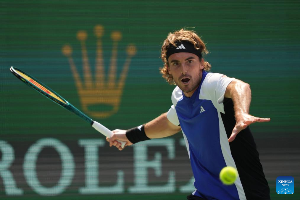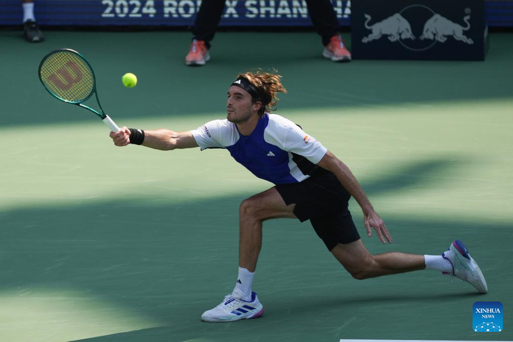 SHANGHAI, 8 octubre, 2024 (Xinhua) -- Stefanos Tsitsipas devuelve la pelota durante el partido de octavos de final de individuales masculinos entre Stefanos Tsitsipas, de Grecia, y Alexandre Müller, de Francia, en el torneo de tenis Masters de Shanghai en el ATP World Tour, en Shanghai, en el este de China, el 8 de octubre de 2024. (Xinhua/Xu Yanan)