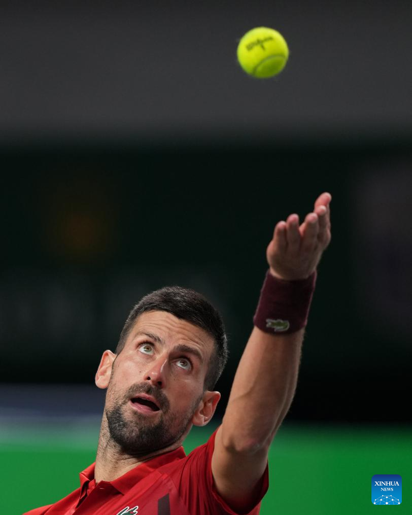 SHANGHAI, 8 octubre, 2024 (Xinhua) -- Novak Djokovic sirve la pelota durante el partido de octavos de final de individuales masculinos entre Novak Djokovic, de Serbia, y Flavio Cobolli, de Italia, en el torneo de tenis Masters de Shanghai en el ATP World Tour, en Shanghai, en el este de China, el 8 de octubre de 2024. (Xinhua/Xu Yanan)