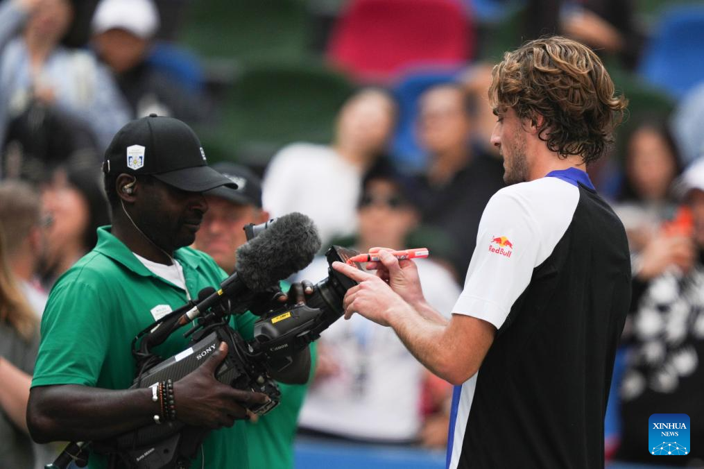 SHANGHAI, 8 octubre, 2024 (Xinhua) -- Stefanos Tsitsipas (d) firma un autógrafo a la cámara al término del partido de octavos de final de individuales masculinos entre Stefanos Tsitsipas, de Grecia, y Alexandre Müller, de Francia, en el torneo de tenis Masters de Shanghai en el ATP World Tour, en Shanghai, en el este de China, el 8 de octubre de 2024. (Xinhua/Xu Yanan)
