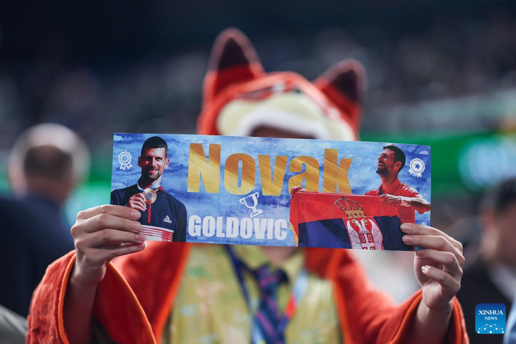 SHANGHAI, 8 octubre, 2024 (Xinhua) -- Un aficionado de Novak Djokovic muestra una pancarta durante el partido de octavos de final de individuales masculinos entre Novak Djokovic, de Serbia, y Flavio Cobolli, de Italia, en el torneo de tenis Masters de Shanghai en el ATP World Tour, en Shanghai, en el este de China, el 8 de octubre de 2024. (Xinhua/Bai Xuefei)