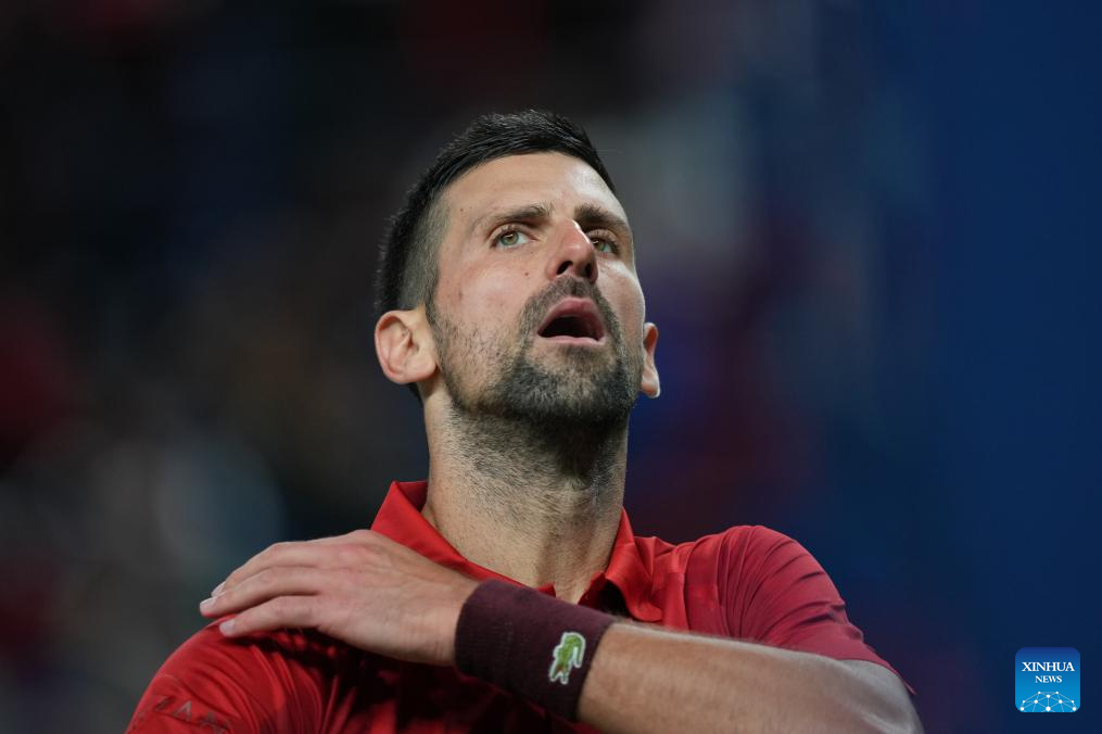 SHANGHAI, 8 octubre, 2024 (Xinhua) -- Novak Djokovic reacciona durante el partido de octavos de final de individuales masculinos entre Novak Djokovic, de Serbia, y Flavio Cobolli, de Italia, en el torneo de tenis Masters de Shanghai en el ATP World Tour, en Shanghai, en el este de China, el 8 de octubre de 2024. (Xinhua/Xu Yanan)