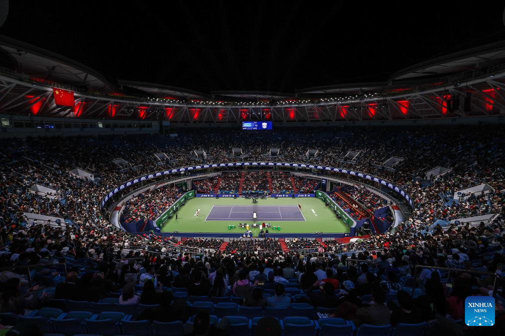 SHANGHAI, 8 octubre, 2024 (Xinhua) -- Novak Djokovic, de Serbia, y Flavio Cobolli, de Italia, compiten durante el partido de octavos de final de individuales masculinos en el torneo de tenis Masters de Shanghai en el ATP World Tour, en Shanghai, en el este de China, el 8 de octubre de 2024. (Xinhua/Bai Xuefei)