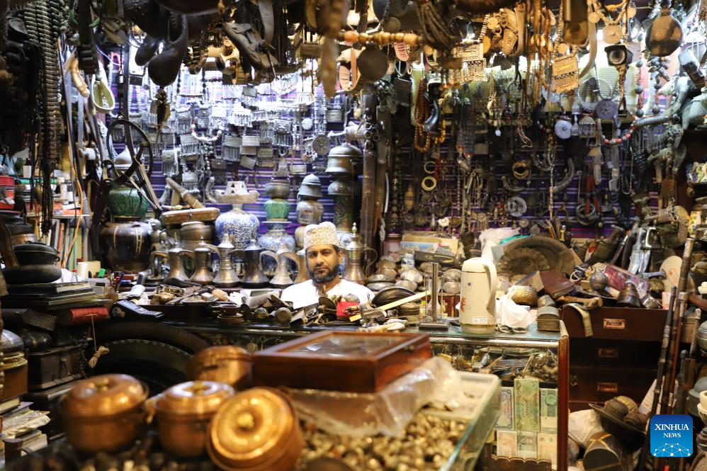 MASCATE, 9 octubre, 2024 (Xinhua) -- Imagen del 8 de octubre de 2024 de productos exhibidos en una tienda en el mercado Mutrah Souq, en Mascate, Omán. El Mutrah Souq, situado a lo largo del paseo marítimo de Mascate, es un mercado árabe tradicional. Las tiendas aquí ofrecen artefactos, antigüedades, textiles y joyería, lo que convierte al mercado en una de las atracciones turísticas más conocidas de Mascate. (Xinhua/Wang Qiang)