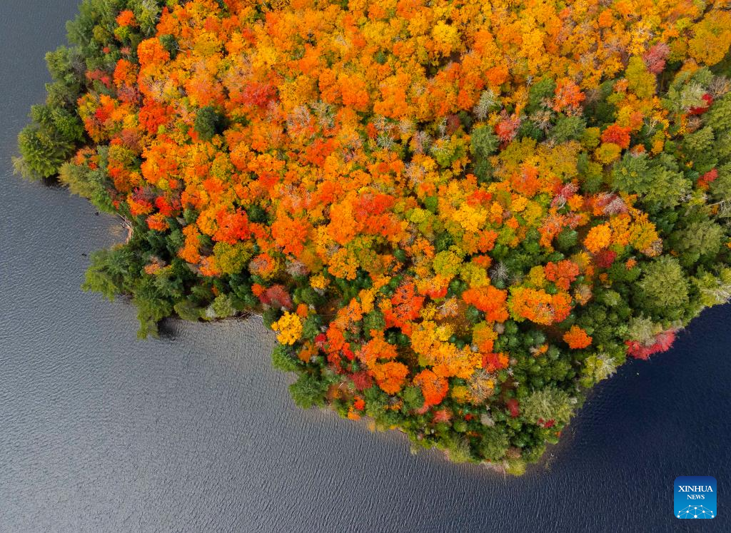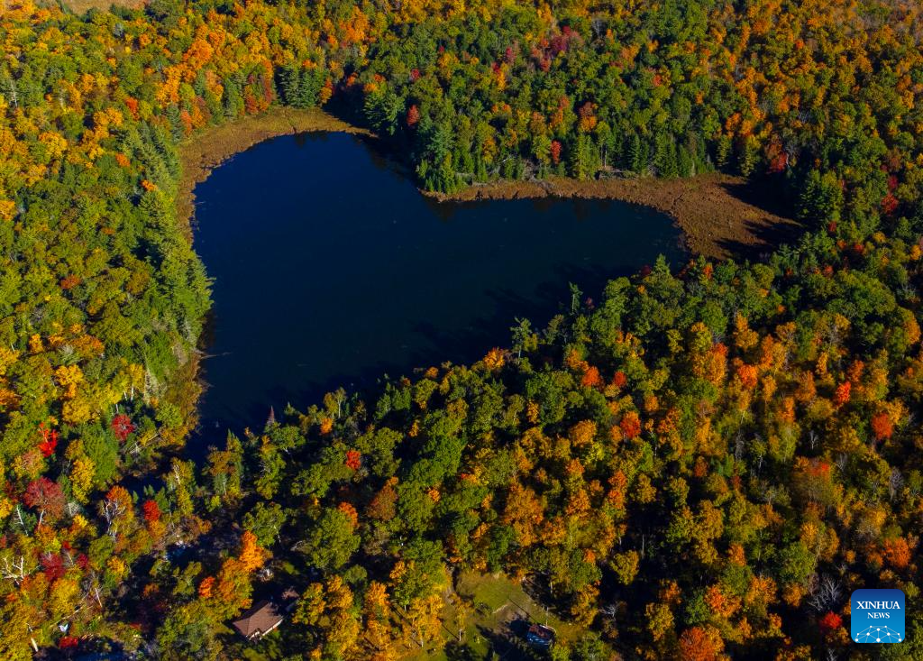 ONTARIO, 9 octubre, 2024 (Xinhua) -- Imagen aérea tomada con un dron el 8 de octubre de 2024 del paisaje otoñal de un lago en forma de corazón, en North Frontenac, Ontario, Canadá. (Xinhua/Zou Zheng)