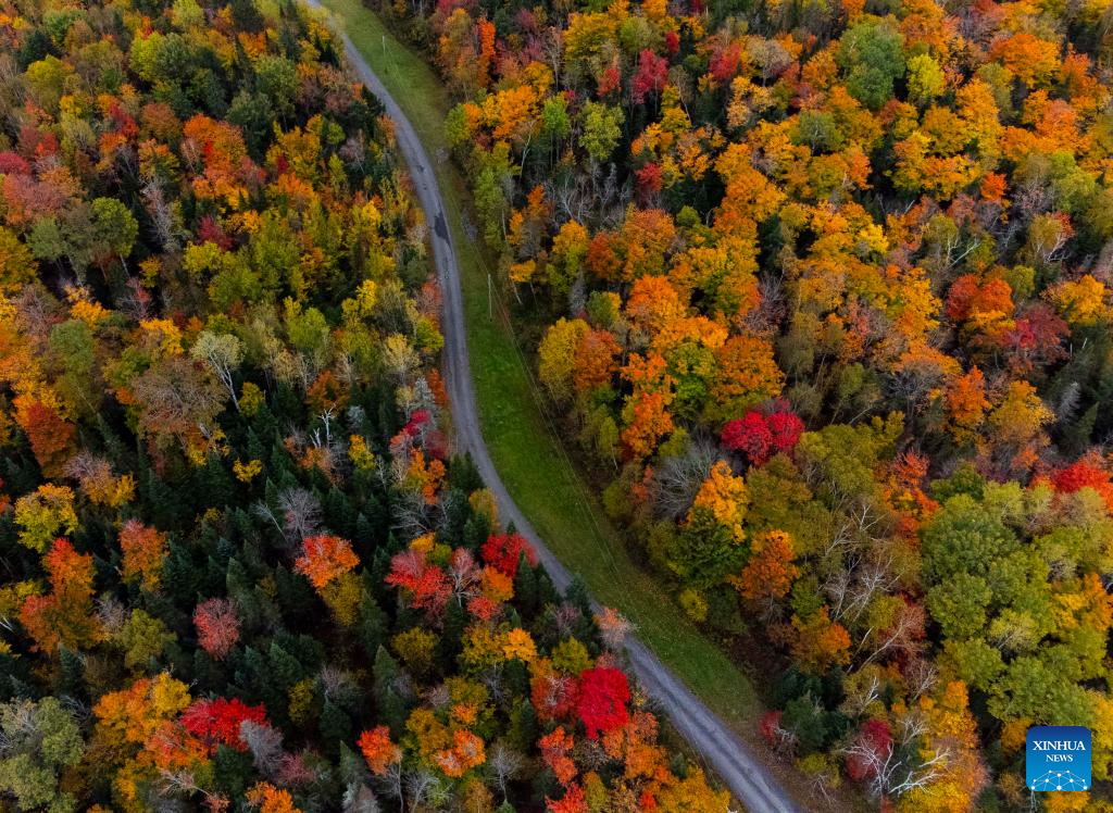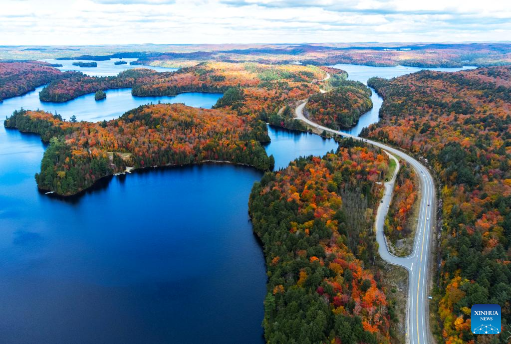 ONTARIO, 9 octubre, 2024 (Xinhua) -- Imagen aérea tomada con un dron el 8 de octubre de 2024 del paisaje otoñal cerca de la autopista 60, en Ontario, Canadá. (Xinhua/Zou Zheng)