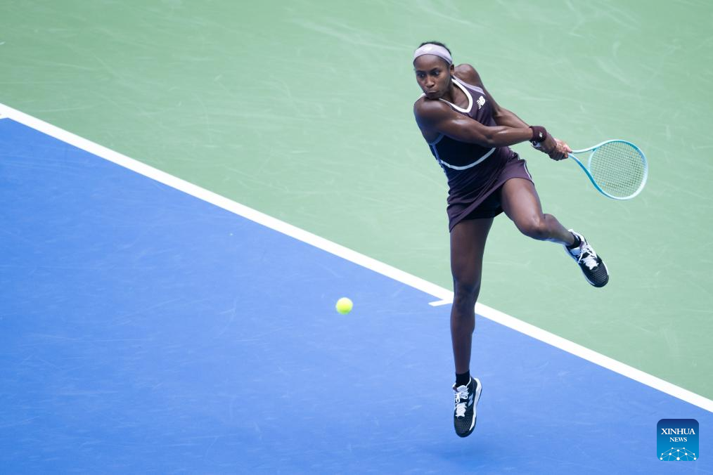 WUHAN, 9 octubre, 2024 (Xinhua) -- Coco Gauff, de Estados Unidos, devuelve la pelota durante el partido de la ronda de 16avos de final ante Viktoriya Tomova, de Bulgaria, en el torneo de tenis Abierto de Wuhan 2024, en Wuhan, capital de la provincia de Hubei, en el centro de China, el 9 de octubre de 2024. (Xinhua/Xiao Yijiu)