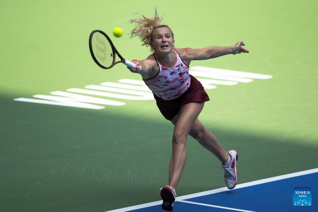 WUHAN, 9 octubre, 2024 (Xinhua) -- Katerina Siniakova devuelve la pelota durante el partido de la ronda de 16avos de final de individuales femeninos entre Aryna Sabalenka, de Bielorrusia, y Katerina Siniakova, de República Checa, en el torneo de tenis Abierto de Wuhan 2024, en Wuhan, capital de la provincia de Hubei, en el centro de China, el 9 de octubre de 2024. (Xinhua/Xiao Yijiu)