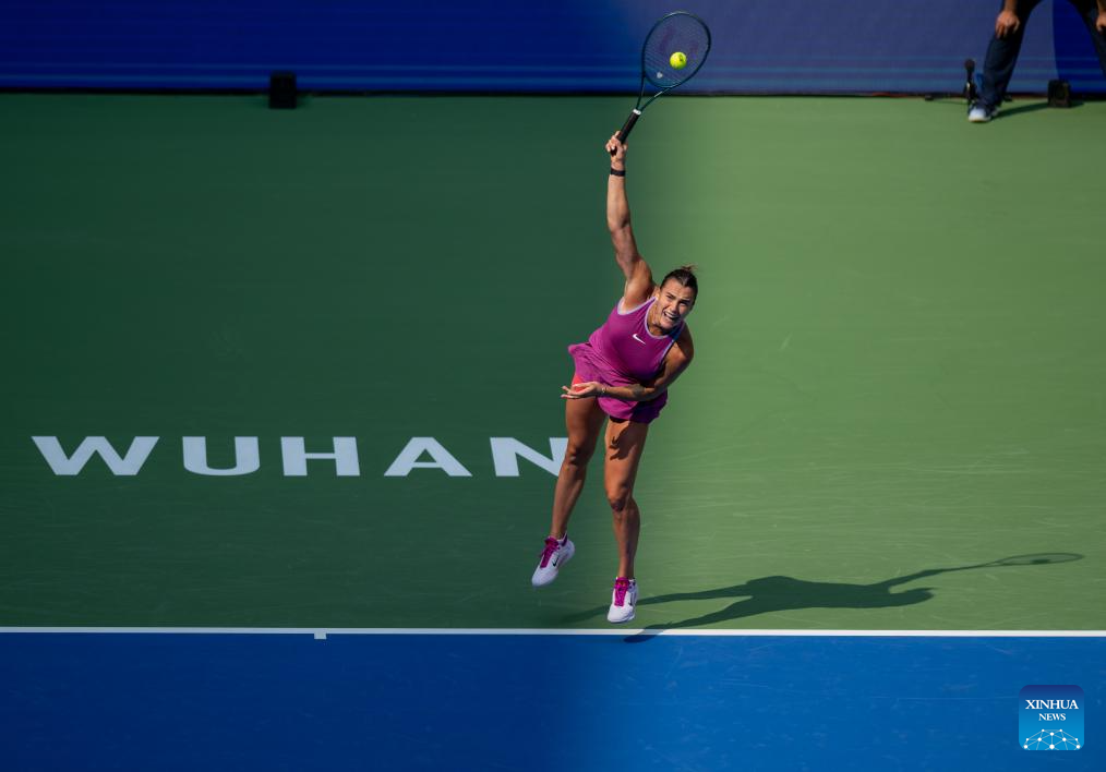 WUHAN, 9 octubre, 2024 (Xinhua) -- Aryna Sabalenka sirve la pelota durante el partido de la ronda de 16avos de final de individuales femeninos entre Aryna Sabalenka, de Bielorrusia, y Katerina Siniakova, de República Checa, en el torneo de tenis Abierto de Wuhan 2024, en Wuhan, capital de la provincia de Hubei, en el centro de China, el 9 de octubre de 2024. (Xinhua/Hu Jingwen)