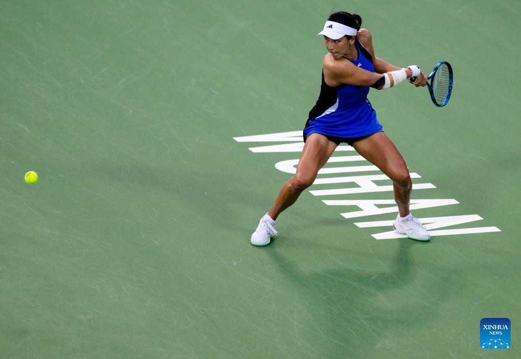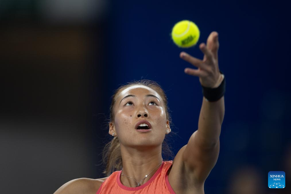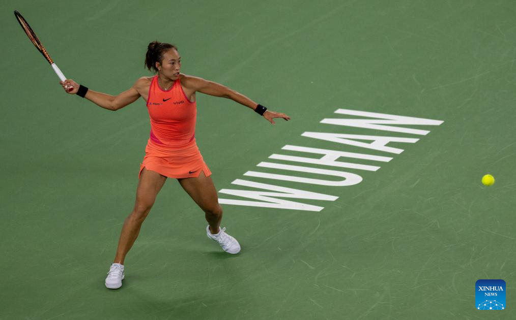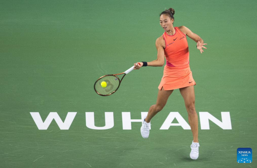 WUHAN, 9 octubre, 2024 (Xinhua) -- Zheng Qinwen devuelve la pelota durante el partido de la ronda de 16avos de final entre Zheng Qinwen, de China, y Jaqueline Cristian, de Rumania, en el torneo de tenis Abierto de Wuhan 2024, en Wuhan, capital de la provincia de Hubei, en el centro de China, el 9 de octubre de 2024. (Xinhua/Xiao Yijiu)