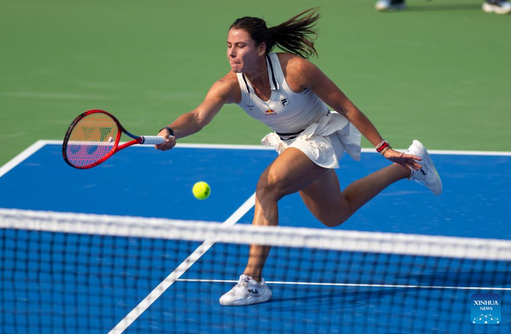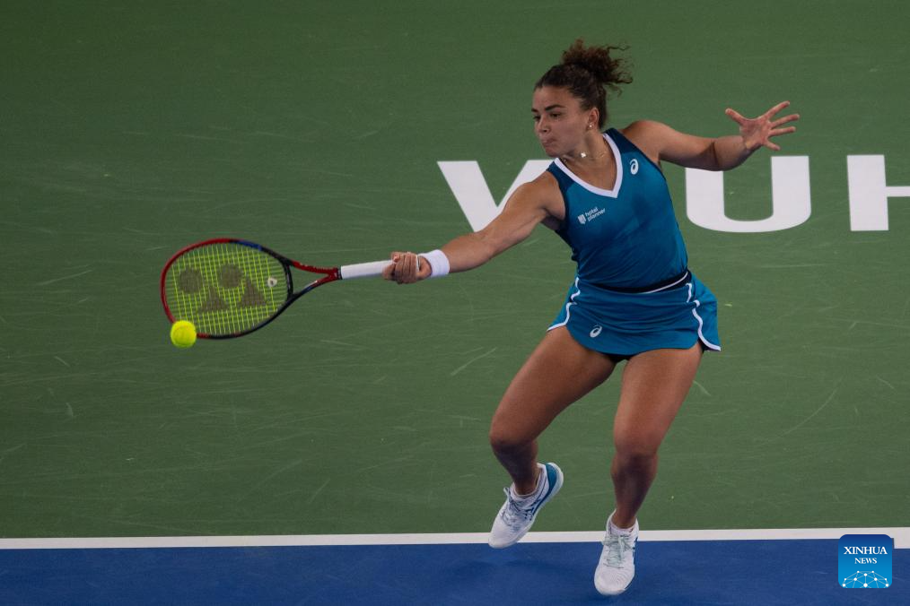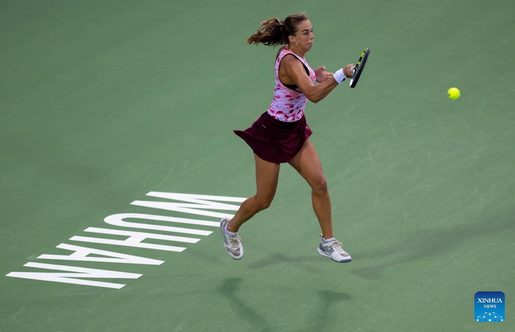 WUHAN, 9 octubre, 2024 (Xinhua) -- Lucia Bronzetti devuelve la pelota durante el partido de la ronda de 16avos de final de individuales femeninos entre Wang Xinyu, de China, y Lucia Bronzetti, de Italia, en el torneo de tenis Abierto de Wuhan 2024, en Wuhan, capital de la provincia de Hubei, en el centro de China, el 9 de octubre de 2024. (Xinhua/Hu Jingwen)
