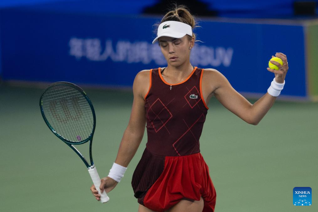 WUHAN, 9 octubre, 2024 (Xinhua) -- Jaqueline Cristian reacciona durante el partido de la ronda de 16avos de final entre Zheng Qinwen, de China, y Jaqueline Cristian, de Rumania, en el torneo de tenis Abierto de Wuhan 2024, en Wuhan, capital de la provincia de Hubei, en el centro de China, el 9 de octubre de 2024. (Xinhua/Xiao Yijiu)