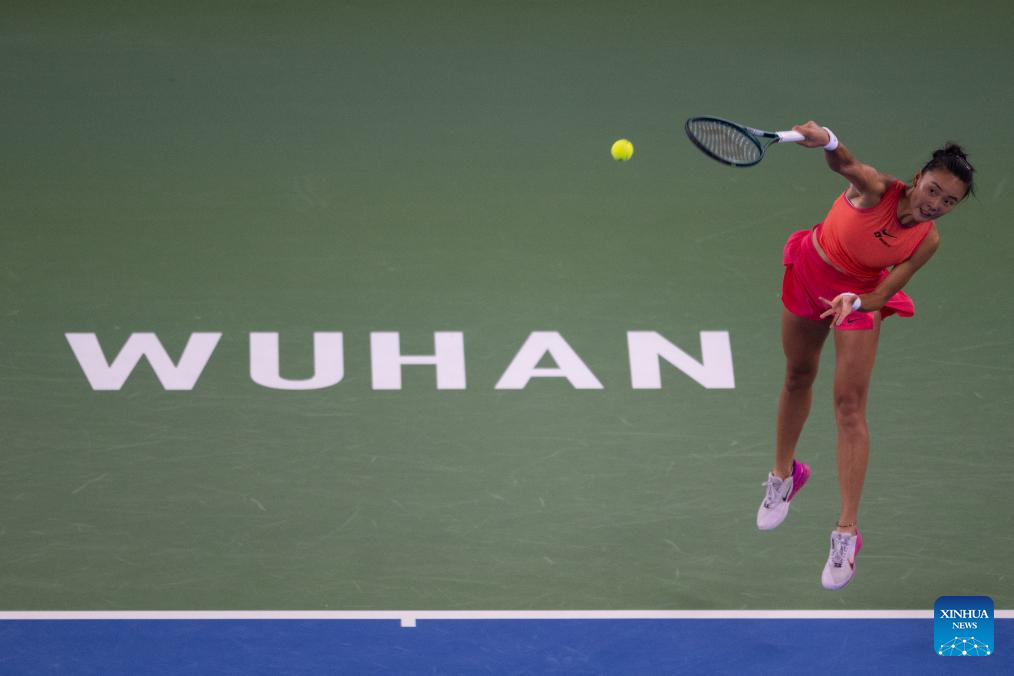 WUHAN, 9 octubre, 2024 (Xinhua) -- Zheng Qinwen sirve la pelota durante el partido de la ronda de 16avos de final entre Zheng Qinwen, de China, y Jaqueline Cristian, de Rumania, en el torneo de tenis Abierto de Wuhan 2024, en Wuhan, capital de la provincia de Hubei, en el centro de China, el 9 de octubre de 2024. (Xinhua/Xiao Yijiu)