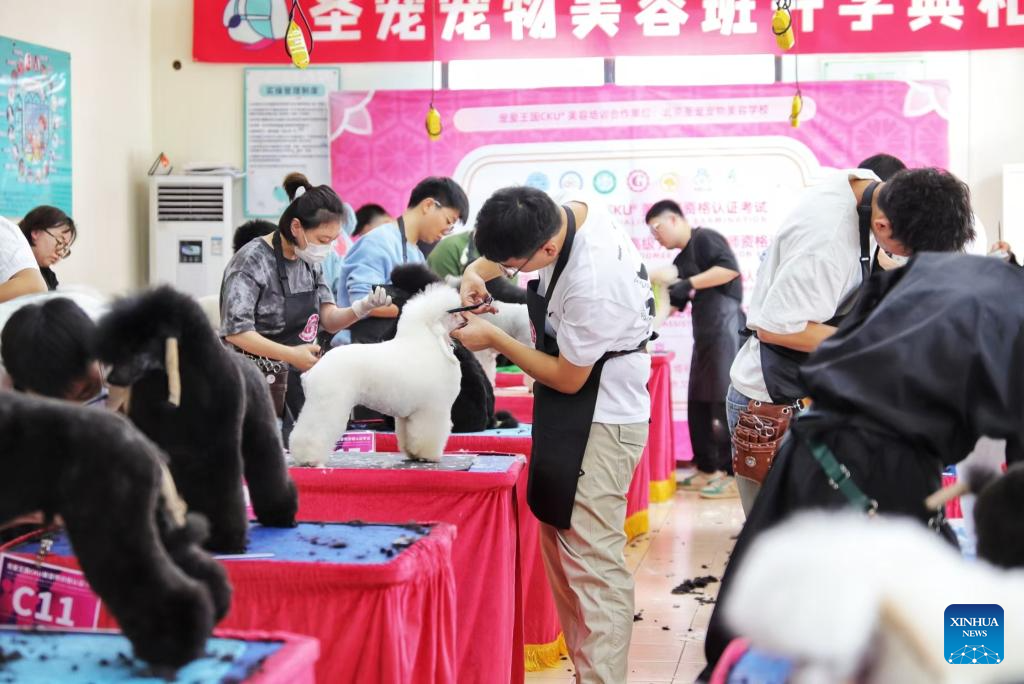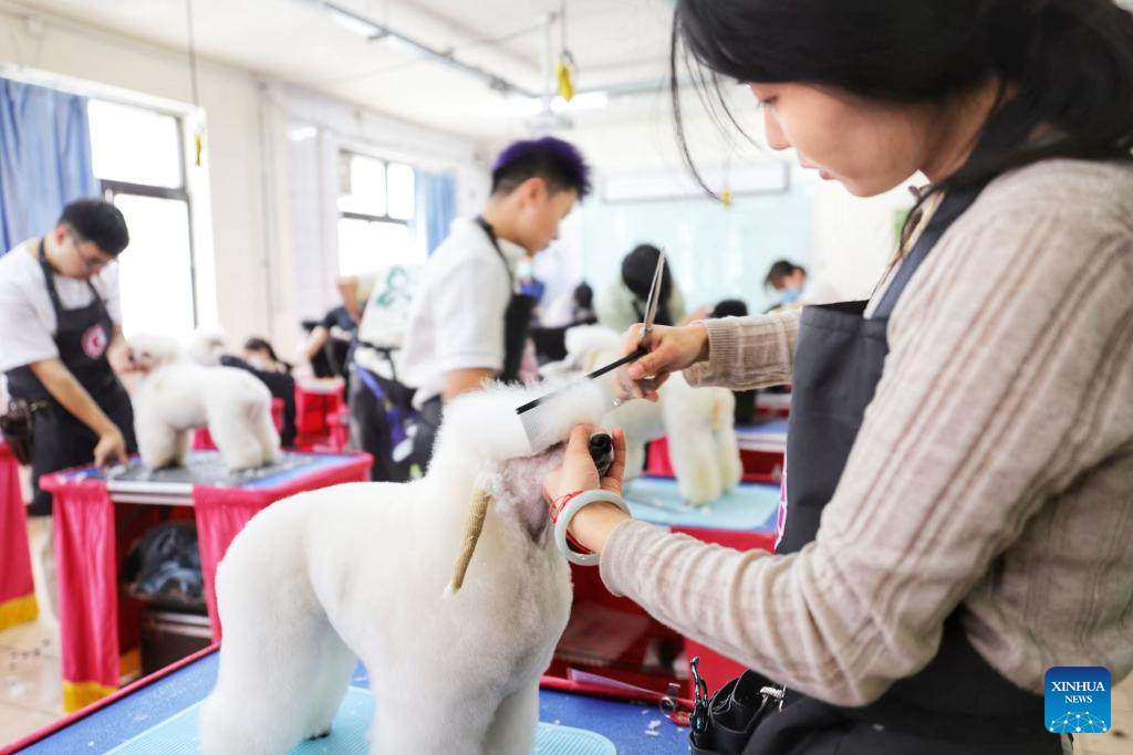 BEIJING, 10 octubre, 2024 (Xinhua) -- Imagen del 15 de abril de 2024 de una prueba de clasificación de estilistas de mascotas llevándose a cabo en la sede de Favor Pets, una franquicia que ofrece servicios para mascotas, en Beijing, capital de China. En la década de 1990, las marcas internacionales de mascotas comenzaron a ingresar al mercado chino, mientras que las marcas nacionales eran prácticamente inexistentes. Sin embargo, después del año 2000, el número de mascotas en China aumentó, y los dueños de mascotas se centraron más en el compañerismo emocional que simplemente en tener mascotas por seguridad en el hogar. Este cambio impulsó el rápido crecimiento de la economía de las mascotas de China. (Xinhua)