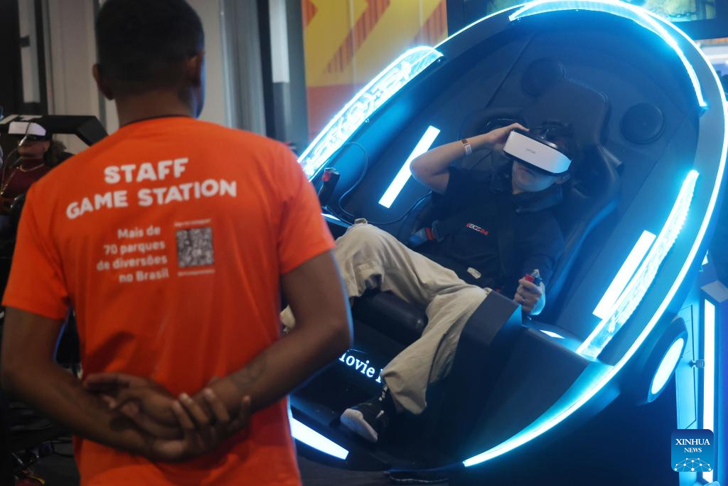 SAO PAULO, 11 octubre, 2024 (Xinhua) -- Imagen del 10 de octubre de 2024 de un hombre probando un dispositivo de realidad virtual durante el Brasil Game Show, en Sao Paulo, Brasil. (Xinhua/Rahel Patrasso)