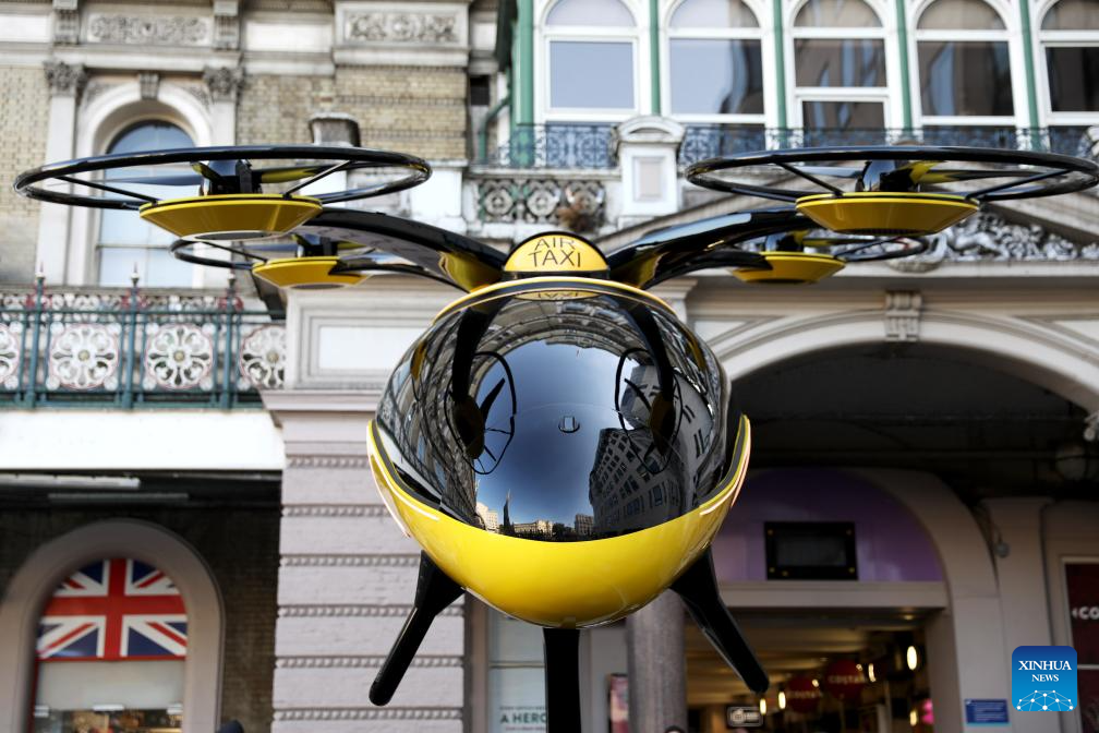 LONDRES, 12 octubre, 2024 (Xinhua) -- Imagen del 11 de octubre de 2024 de un prototipo de un taxi volador, actualmente en desarrollo en los Emiratos Arabes Unidos (EAU), visto en exhibición en la parada de taxis frente a la estación del ferrocarril de Charing Cross, en Londres, Reino Unido. (Xinhua/Li Ying)