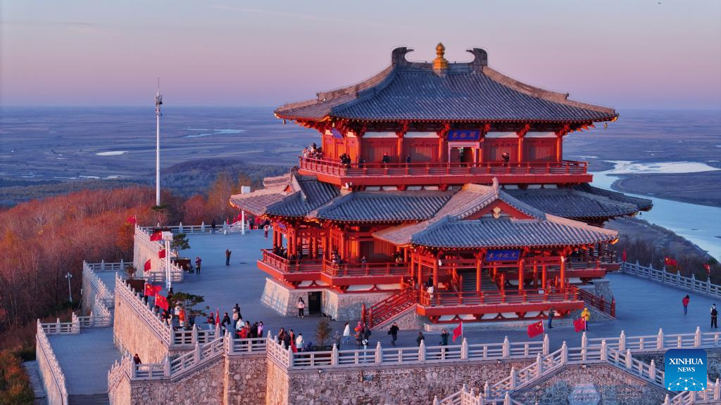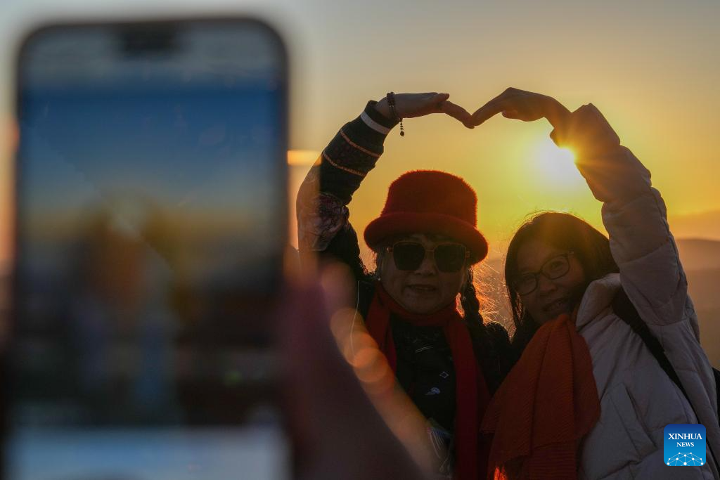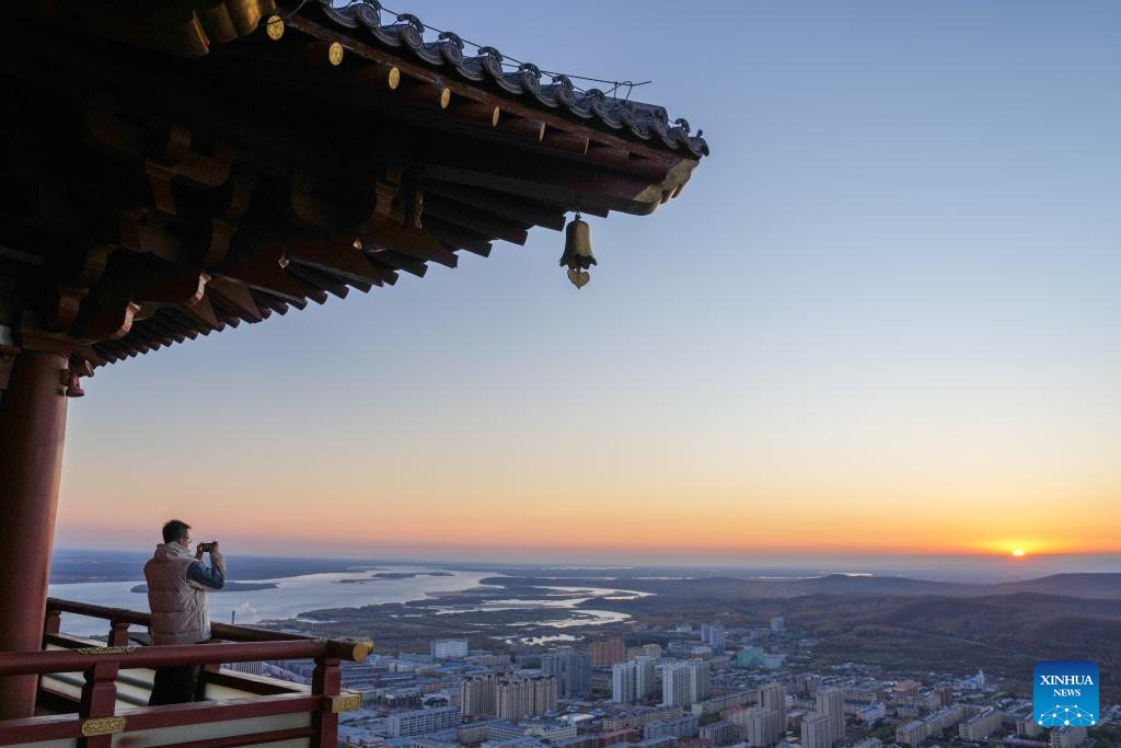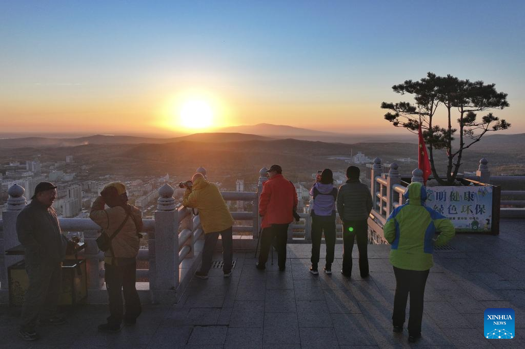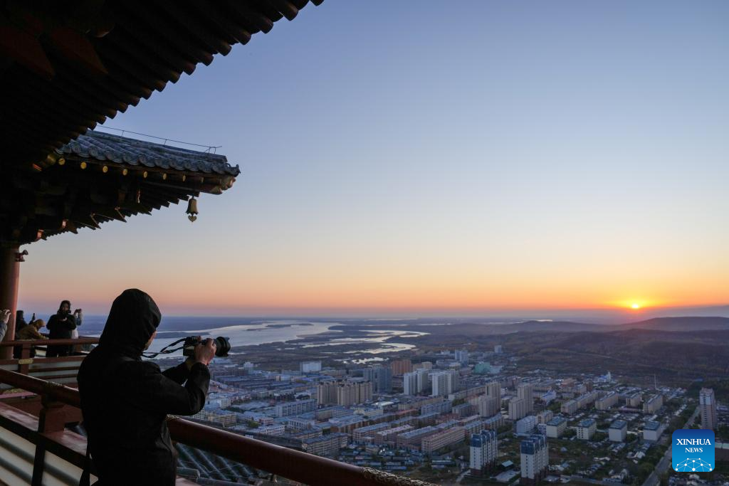 FUYUAN, 12 octubre, 2024 (Xinhua) -- Turistas posan para fotografías con el Sol saliente, en la ciudad de Fuyuan, en la provincia de Heilongjiang, en el noreste de China, el 12 de octubre de 2024. La ciudad de Fuyuan, una famosa atracción turística, ha atraído a más de 2,1 millones de visitantes de enero a septiembre de este año. (Xinhua/Wang Jianwei)