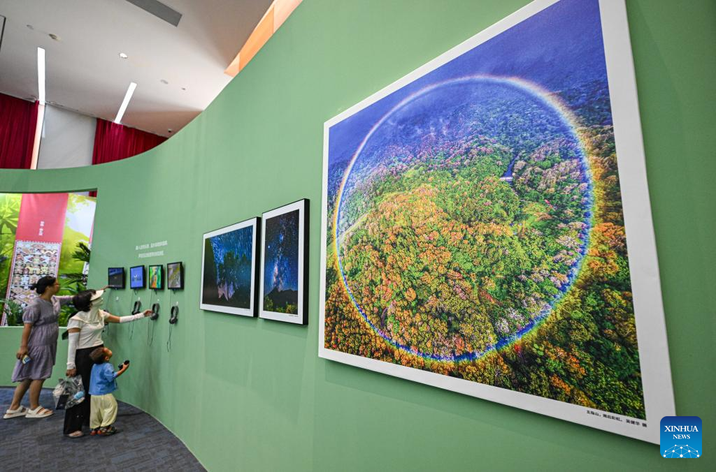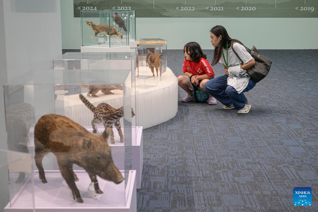 HAIKOU, 13 octubre, 2024 (Xinhua) -- Personas visitan la exposición "Protegiendo el Hogar de la Selva Tropical", en Haikou, en la provincia de Hainan, en el sur de China, el 13 de octubre de 2024. La exposición "Protegiendo el Hogar de la Selva Tropical" fue realizada por la oficina de gestión del Parque Nacional de la Selva Tropical de Hainan en Haikou. Presentando especímenes de animales, fotografías y videos, la exposición muestra la belleza de la selva tropical y presenta el proceso de construcción del Parque Nacional de la Selva Tropical de Hainan. (Xinhua/Pu Xiaoxu)
