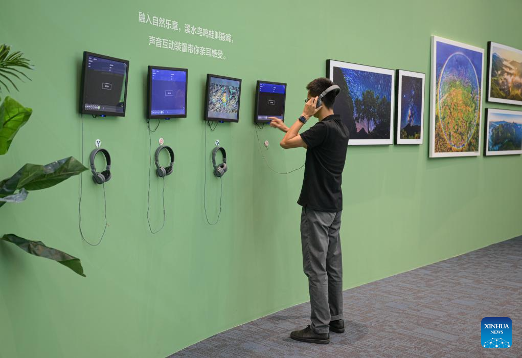 HAIKOU, 13 octubre, 2024 (Xinhua) -- Un hombre escucha el sonido de la naturaleza en la exposición "Protegiendo el Hogar de la Selva Tropical", en Haikou, en la provincia de Hainan, en el sur de China, el 13 de octubre de 2024. La exposición "Protegiendo el Hogar de la Selva Tropical" fue realizada por la oficina de gestión del Parque Nacional de la Selva Tropical de Hainan en Haikou. Presentando especímenes de animales, fotografías y videos, la exposición muestra la belleza de la selva tropical y presenta el proceso de construcción del Parque Nacional de la Selva Tropical de Hainan. (Xinhua/Pu Xiaoxu)