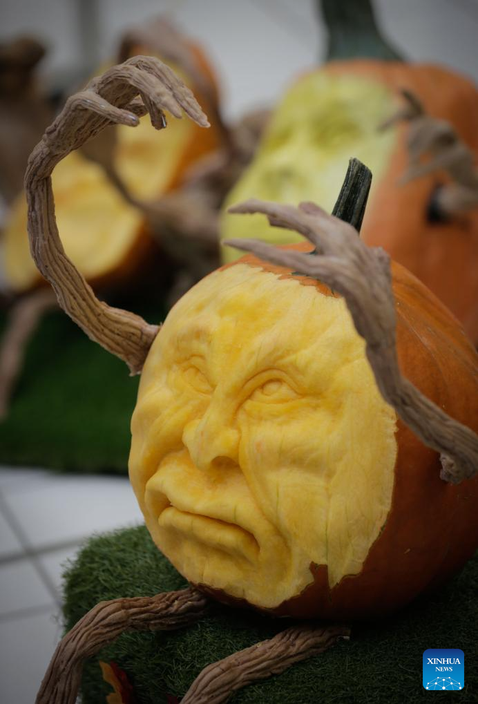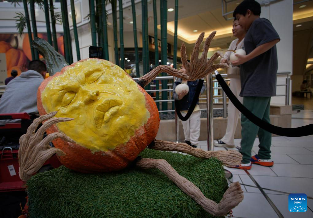 BURNABY, 13 octubre, 2024 (Xinhua) -- Imagen del 12 de octubre de 2024 de una calabaza tallada exhibida durante el Espectáculo de Tallado de Calabaza en el centro comercial Metrotown, en Burnaby, Columbia Británica, Canadá. (Xinhua/Liang Sen)