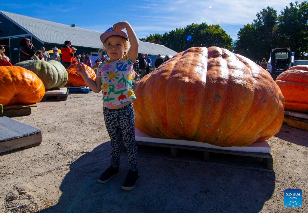 WOODBRIDGE, 13 octubre, 2024 (Xinhua) -- Imagen del 12 de octubre de 2024 de una niña posando para fotografías durante un concurso de calabazas gigantes en la Feria de Otoño de Woodbridge, en Woodbridge, Ontario, Canadá. (Xinhua/Zou Zheng)