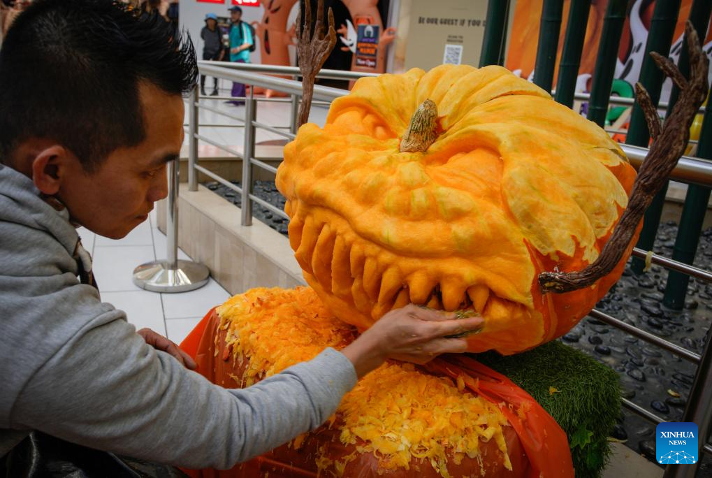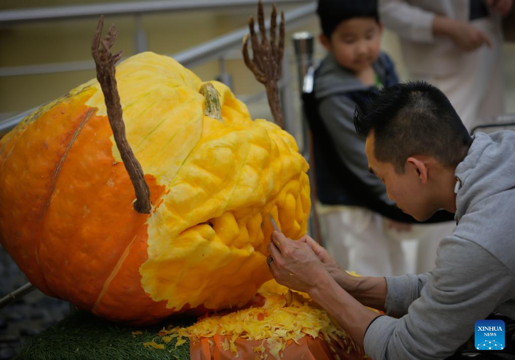 BURNABY, 13 octubre, 2024 (Xinhua) -- Imagen del 12 de octubre de 2024 de un artista tallando una calabaza durante el Espectáculo de Tallado de Calabaza en el centro comercial Metrotown, en Burnaby, Columbia Británica, Canadá. (Xinhua/Liang Sen)