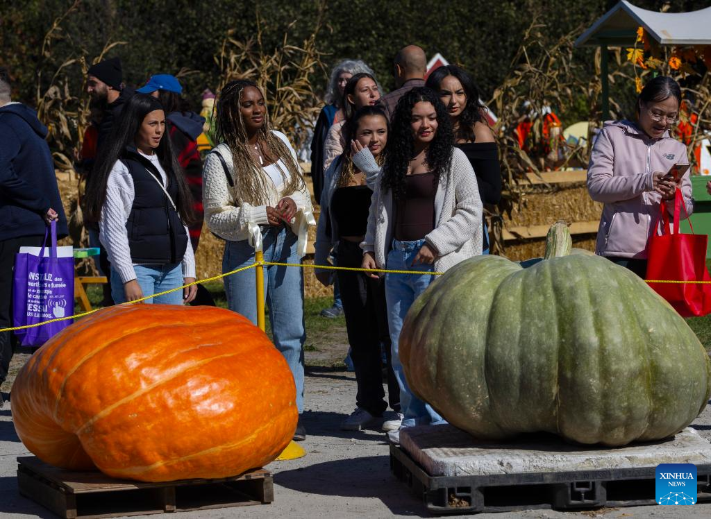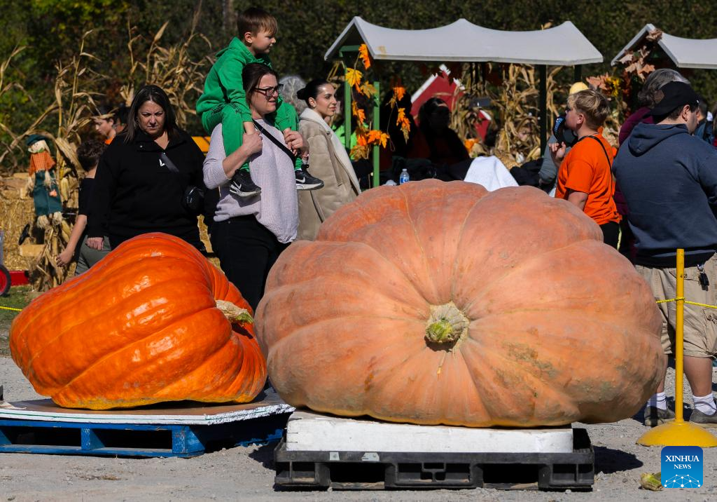 WOODBRIDGE, 13 octubre, 2024 (Xinhua) -- Imagen del 12 de octubre de 2024 de personas visitando un concurso de calabazas gigantes en la Feria de Otoño de Woodbridge, en Woodbridge, Ontario, Canadá. (Xinhua/Zou Zheng)