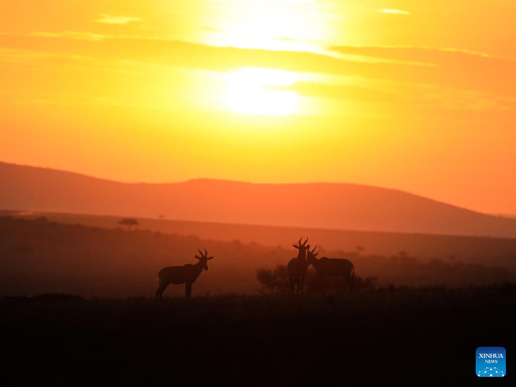 NAIROBI, 14 octubre, 2024 (Xinhua) -- Imagen del 12 de octubre de 2024 del paisaje del atardecer en la Reserva Nacional Masai Mara de Kenia. El condado de Narok, en el suroeste de Kenia, es hogar de la mundialmente famosa Reserva Nacional Masai Mara en donde los turistas acuden durante la temporada alta de turismo del país, de junio a octubre, para observar la migración de ñus. (Xinhua/Han Xu)