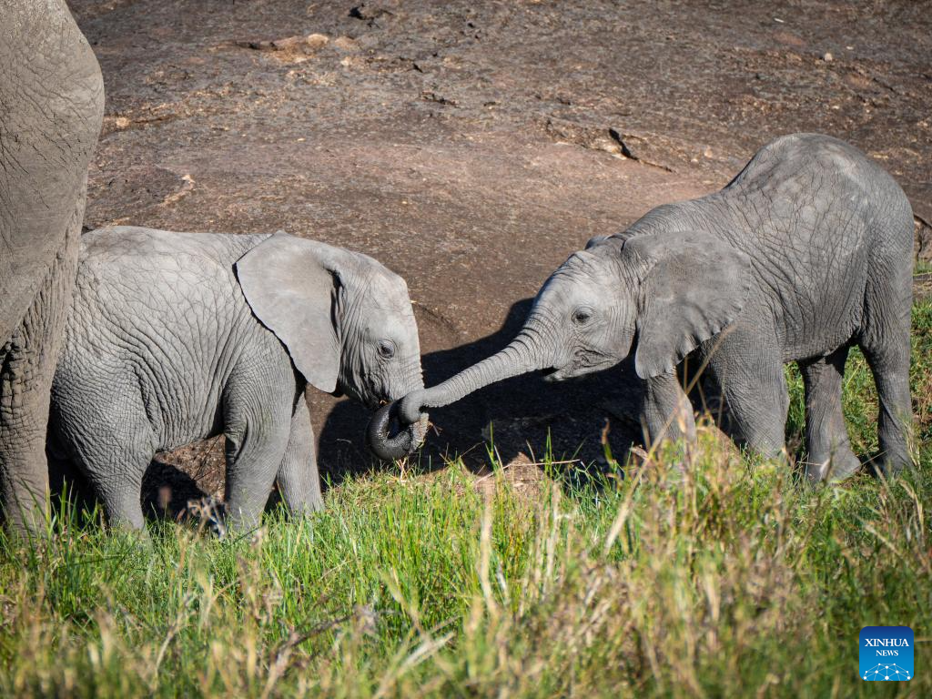 NAIROBI, 14 octubre, 2024 (Xinhua) -- Imagen del 12 de octubre de 2024 de dos elefantes bebés jugando en la Reserva Nacional Masai Mara de Kenia. El condado de Narok, en el suroeste de Kenia, es hogar de la mundialmente famosa Reserva Nacional Masai Mara en donde los turistas acuden durante la temporada alta de turismo del país, de junio a octubre, para observar la migración de ñus. (Xinhua/Li Yahui)