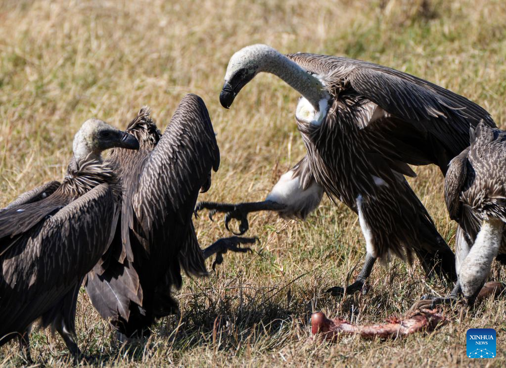 NAIROBI, 14 octubre, 2024 (Xinhua) -- Imagen del 12 de octubre de 2024 de buitres enfrentándose por comida en la Reserva Nacional Masai Mara de Kenia. El condado de Narok, en el suroeste de Kenia, es hogar de la mundialmente famosa Reserva Nacional Masai Mara en donde los turistas acuden durante la temporada alta de turismo del país, de junio a octubre, para observar la migración de ñus. (Xinhua/Li Yahui)