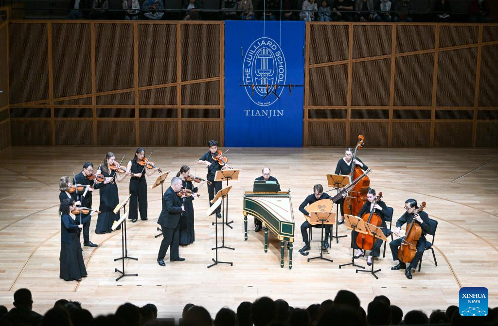 TIANJIN, 14 octubre, 2024 (Xinhua) -- Imagen del 13 de octubre de 2024 de Juilliard415, un conjunto del programa de Interpretación Histórica de Juilliard, presentándose en la Escuela Juilliard de Tianjin, en Tianjin, en el norte de China. El conjunto se encuentra actualmente en una gira de presentaciones que también lo llevará a las ciudades de Beijing, Nanjing, Suzhou y Shanghai. Además de la presentación, el conjunto también ofrecerá conferencias, talleres y ensayos conjuntos en la Escuela Juilliard de Tianjin. (Xinhua/Sun Fanyue)
