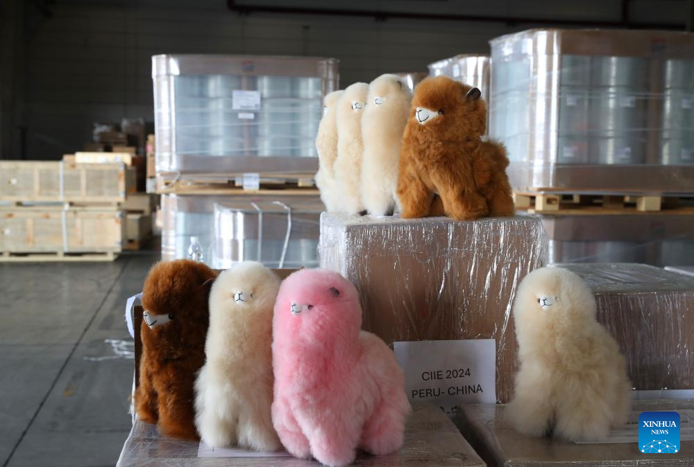 SHANGHAI, 14 octubre, 2024 (Xinhua) -- Imagen del 14 de octubre de 2024 de productos de alpaca de la marca Warmpaca para la VII Exposición Internacional de Importaciones de China (CIIE, por sus siglas en inglés), en un almacén de COSCO Shipping, en Shanghai, en el este de China. La IIV CIIE se celebrará del 5 al 10 de noviembre en Shanghai. (Xinhua/Fang Zhe)