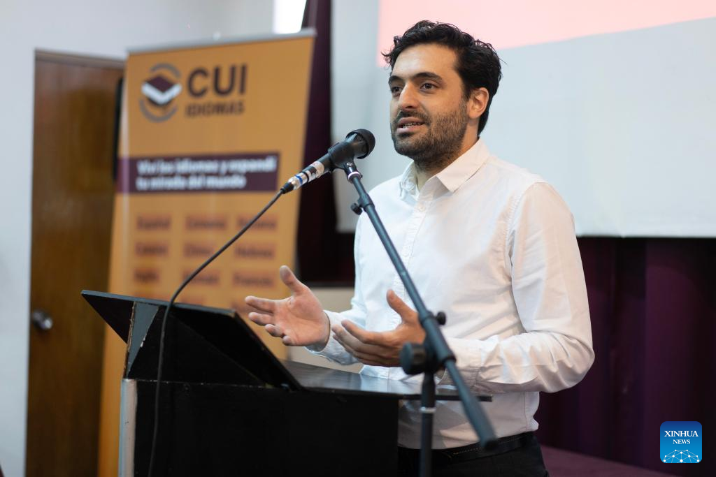 Imagen del 16 de octubre de 2024 del director del Instituto Confucio de la Universidad de Buenos Aires (UBA), Patricio Conejero Ortiz, hablando durante el acto de celebración del 20° aniversario del inicio del programa oficial de enseñanza del idioma chino en Argentina, en el Centro Universitario de Idiomas (CUI) de la UBA, en la ciudad de Buenos Aires, capital de Argentina. El programa oficial de enseñanza del idioma chino en Argentina celebró el miércoles su 20° aniversario con un evento en el CUI de la UBA, donde se resaltó su rol como un puente cultural que, a lo largo de dos décadas, ha fortalecido los lazos entre Argentina y China. (Xinhua/Martín Zabala)