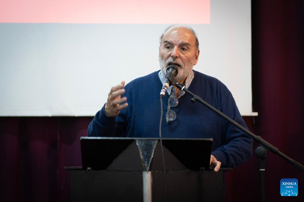 Imagen del 16 de octubre de 2024 del director del Centro Universitario de Idiomas (CUI), Roberto Villarruel, hablando durante el acto de celebración del 20° aniversario del inicio del programa oficial de enseñanza del idioma chino en Argentina, en el CUI de la Universidad de Buenos Aires (UBA), en la ciudad de Buenos Aires, capital de Argentina. El programa oficial de enseñanza del idioma chino en Argentina celebró el miércoles su 20° aniversario con un evento en el CUI de la UBA, donde se resaltó su rol como un puente cultural que, a lo largo de dos décadas, ha fortalecido los lazos entre Argentina y China. (Xinhua/Martín Zabala)