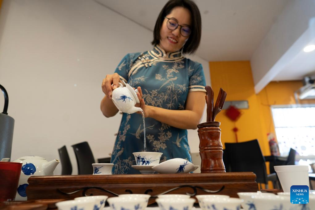 Imagen del 16 de octubre de 2024 de Wen Shi, docente del Centro Universitario de Idiomas (CUI), realizando la "ceremonia del té" durante el acto de celebración del 20° aniversario del inicio del programa oficial de enseñanza del idioma chino en Argentina, en el CUI de la Universidad de Buenos Aires (UBA), en la ciudad de Buenos Aires, capital de Argentina. El programa oficial de enseñanza del idioma chino en Argentina celebró el miércoles su 20° aniversario con un evento en el CUI de la UBA, donde se resaltó su rol como un puente cultural que, a lo largo de dos décadas, ha fortalecido los lazos entre Argentina y China. (Xinhua/Martín Zabala)