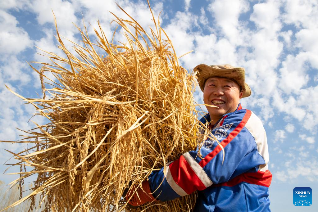 HARBIN, 16 octubre, 2024 (Xinhua) -- Imagen del 13 de octubre de 2024 de un agricultor cargando arroz, en la aldea de Daoxiang de la ciudad de Suihua, en la provincia de Heilongjiang, en el noreste de China. La cosecha de otoño en la provincia de Heilongjiang, una importante base de producción de cereales, está en pleno apogeo. (Xinhua/Zhang Tao)