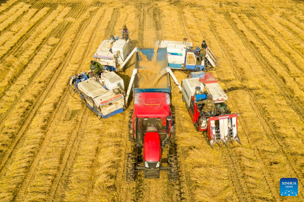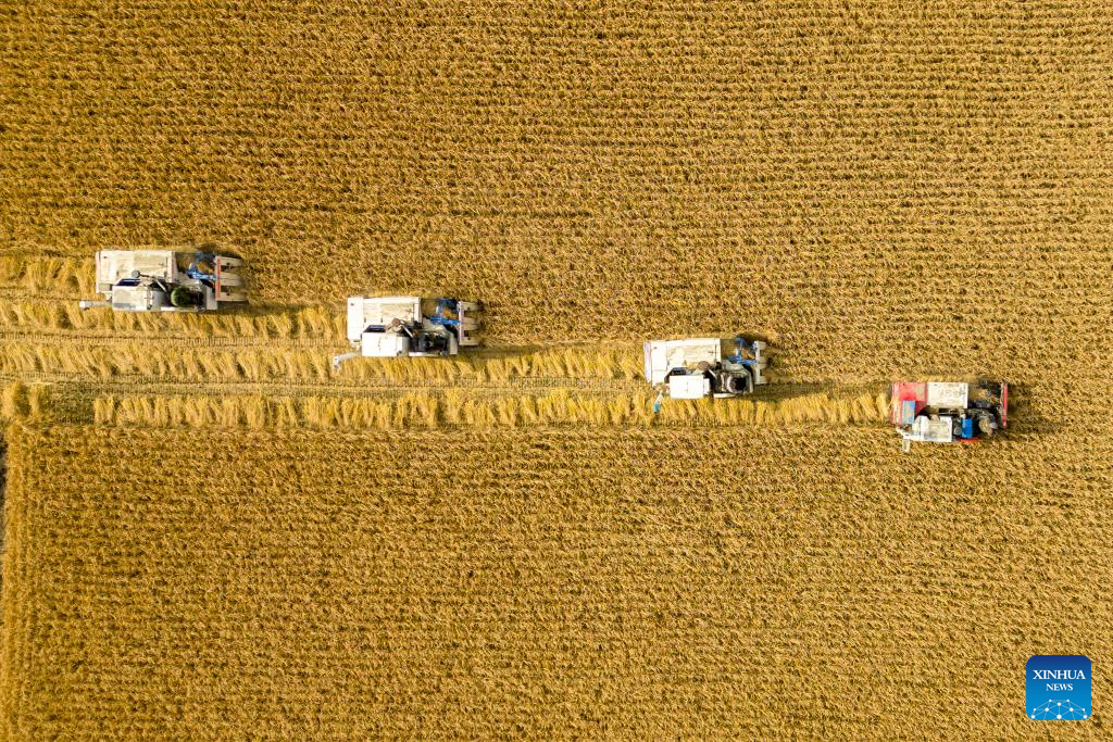 HARBIN, 16 octubre, 2024 (Xinhua) -- Imagen tomada con un dron el 22 de septiembre de 2024 de cosechadoras trabajando en arrozales, en el distrito de Fangzheng, en la provincia de Heilongjiang, en el noreste de China. La cosecha de otoño en la provincia de Heilongjiang, una importante base de producción de cereales, está en pleno apogeo. (Xinhua/Wang Song)