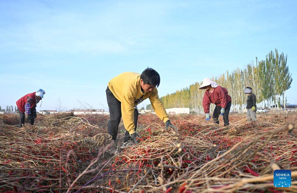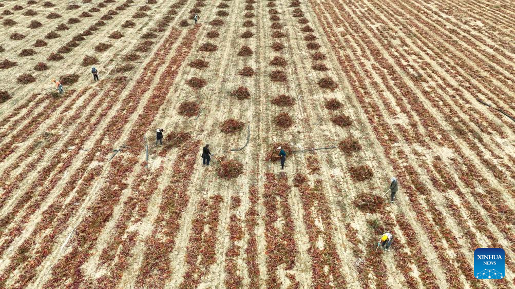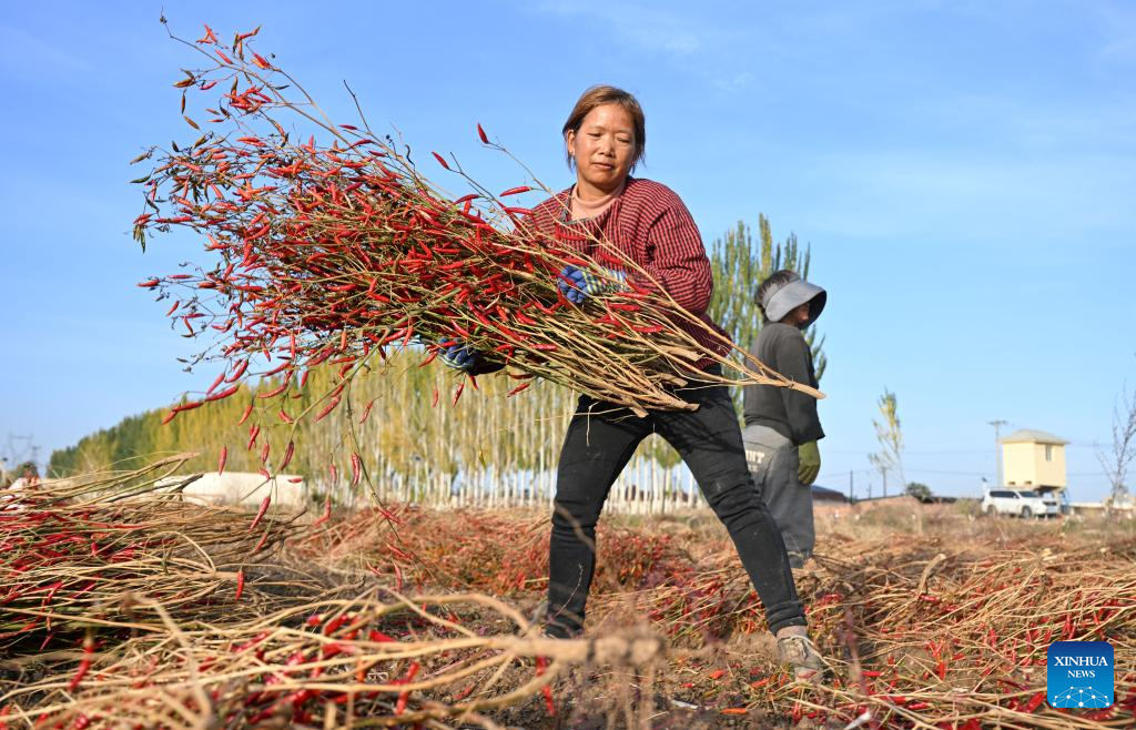 BAYANNUR, 16 octubre, 2024 (Xinhua) -- Imagen del 15 de octubre de 2024 de agricultores aireando chiles en un campo, en el distrito de Linhe de Bayannur, en la región autónoma de Mongolia Interior, en el norte de China. (Xinhua/Liu Lianfen)