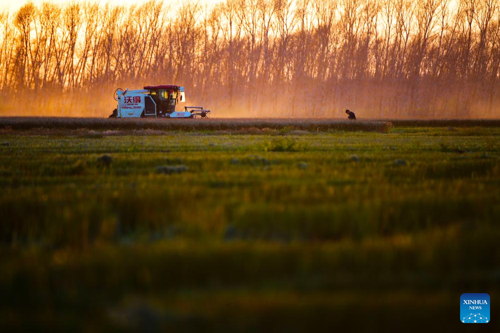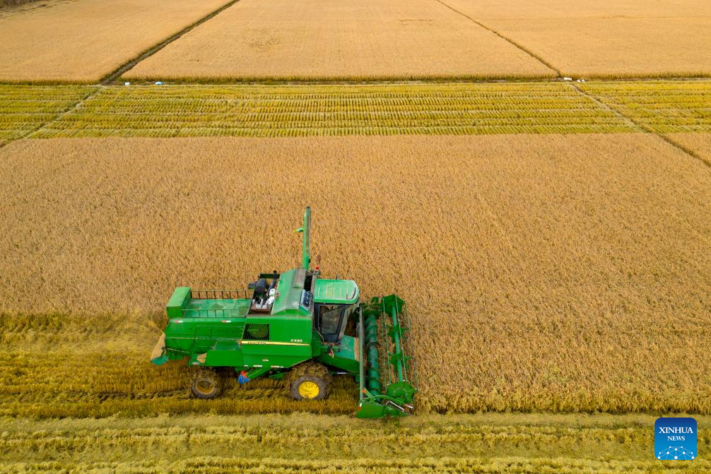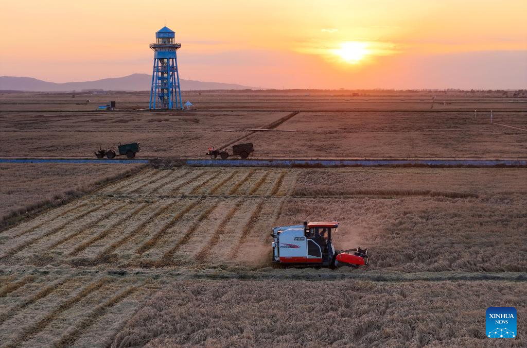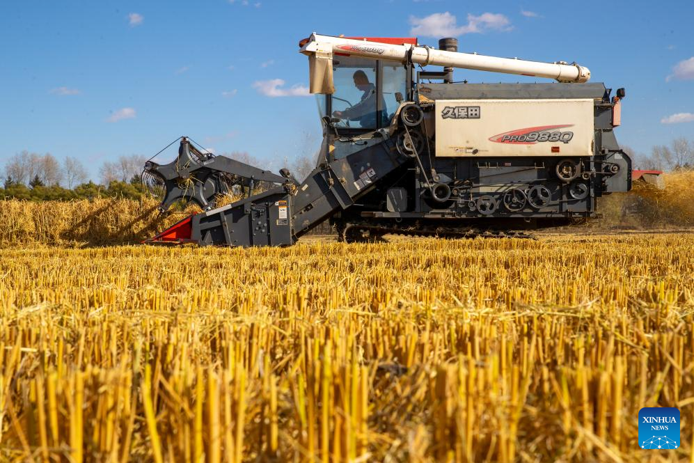 HARBIN, 16 octubre, 2024 (Xinhua) -- Imagen del 13 de octubre de 2024 de una cosechadora trabajando en arrozales en una granja de Beidahuang Group, en la provincia de Heilongjiang, en el noreste de China. La cosecha de otoño en la provincia de Heilongjiang, una importante base de producción de cereales, está en pleno apogeo. (Xinhua/Huang Yongxing)