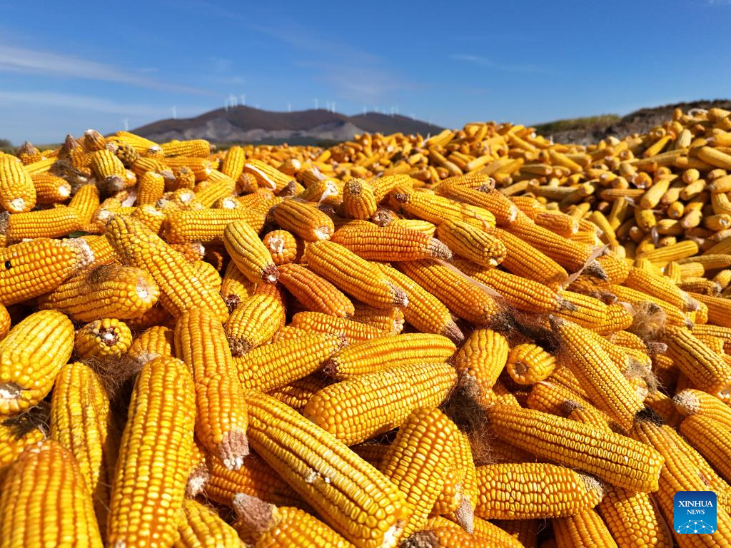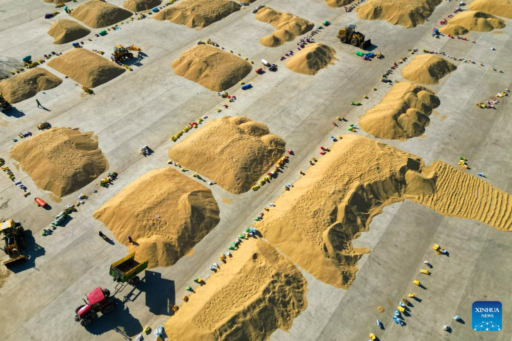 HARBIN, 16 octubre, 2024 (Xinhua) -- Imagen tomada con un dron el 6 de octubre de 2024 de maíz aireado, en la aldea Fushan de la ciudad de Fujin, en la provincia de Heilongjiang, en el noreste de China. La cosecha de otoño en la provincia de Heilongjiang, una importante base de producción de cereales, está en pleno apogeo. (Xinhua/Qu Yubao)