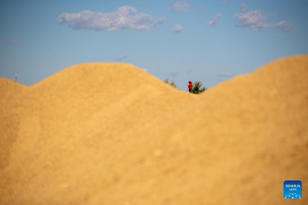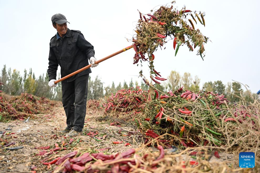 BAYANNUR, 16 octubre, 2024 (Xinhua) -- Un agricultor airea chiles en un campo, en la bandera frontal de Urad de Bayannur, en la región autónoma de Mongolia Interior, en el norte de China, el 16 de octubre de 2024. (Xinhua/Liu Lianfen)