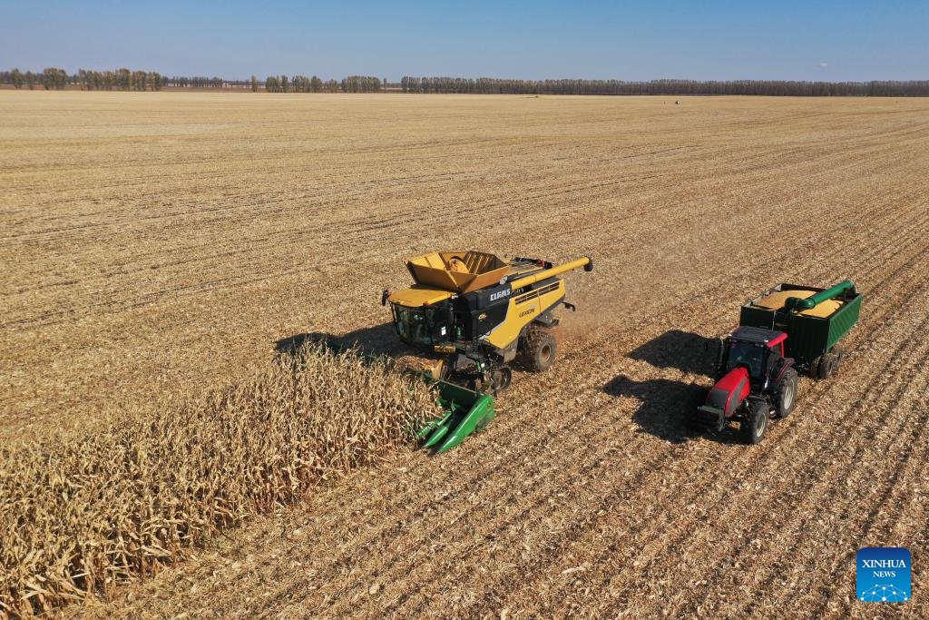 HARBIN, 16 octubre, 2024 (Xinhua) -- Imagen aérea tomada con un dron el 12 de octubre de 2024 de máquinas agrícolas trabajando en campos de maíz en una granja de Beidahuang Group, en la provincia de Heilongjiang, en el noreste de China. La cosecha de otoño en la provincia de Heilongjiang, una importante base de producción de cereales, está en pleno apogeo. (Xinhua/Wang Song)