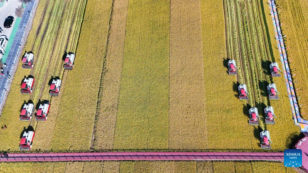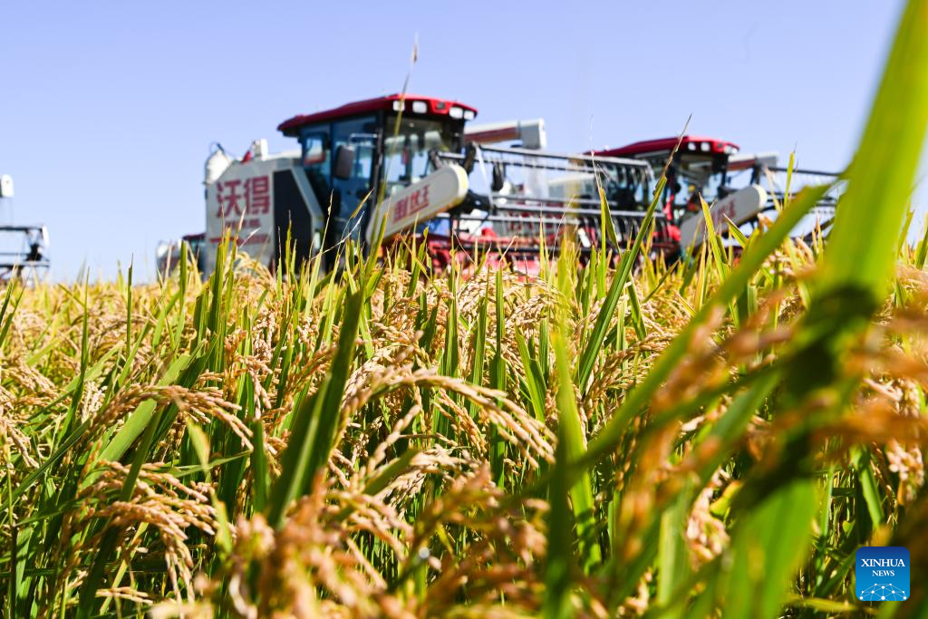 HARBIN, 16 octubre, 2024 (Xinhua) -- Imagen del 22 de septiembre de 2024 de cosechadoras trabajando en arrozales, en el distrito de Fangzheng, en la provincia de Heilongjiang, en el noreste de China. La cosecha de otoño en la provincia de Heilongjiang, una importante base de producción de cereales, está en pleno apogeo. (Xinhua/Wang Song)