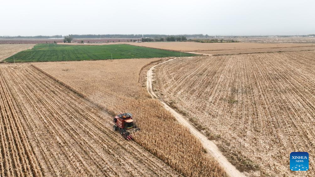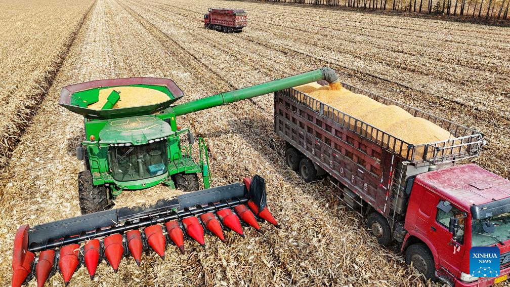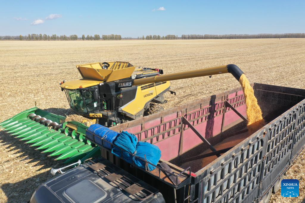 HARBIN, 16 octubre, 2024 (Xinhua) -- Imagen tomada con un dron el 12 de octubre de 2024 de máquinas agrícolas trabajando en los campos de maíz en una granja del Beidahuang Group, en la provincia de Heilongjiang, en el noreste de China. La cosecha de otoño en la provincia de Heilongjiang, una importante base de producción de cereales, está en pleno apogeo. (Xinhua/Wang Song)