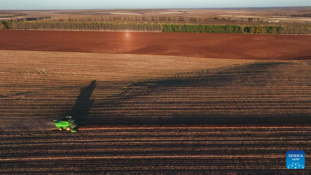 HARBIN, 16 octubre, 2024 (Xinhua) -- Imagen del 12 de octubre de 2024 de una máquina agrícola trabajando en los campos en una granja de Beidahuang Group, en la provincia de Heilongjiang, en el noreste de China. La cosecha de otoño en la provincia de Heilongjiang, una importante base de producción de cereales, está en pleno apogeo. (Xinhua/Zhang Tao)