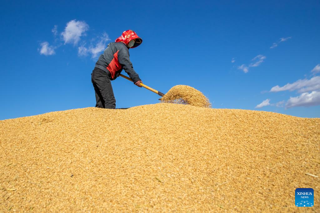 HARBIN, 16 octubre, 2024 (Xinhua) -- Imagen del 12 de octubre de 2024 de un agricultor trabajando entre montones de arroz en una granja del Beidahuang Group, en la provincia de Heilongjiang, en el noreste de China. La cosecha de otoño en la provincia de Heilongjiang, una importante base de producción de cereales, está en pleno apogeo. (Xinhua/Zhang Tao)