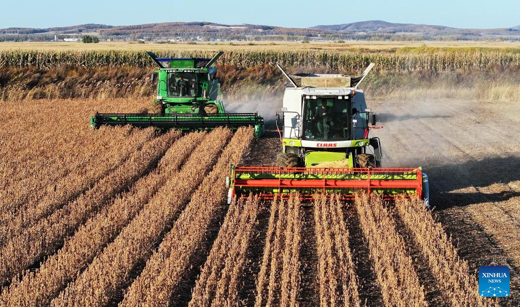 HARBIN, 16 octubre, 2024 (Xinhua) -- Imagen aérea tomada con un dron el 12 de octubre de 2024 de cosechadoras trabajando en campos de soja en una granja de Beidahuang Group, en la provincia de Heilongjiang, en el noreste de China. La cosecha de otoño en la provincia de Heilongjiang, una importante base de producción de cereales, está en pleno apogeo. (Xinhua/Wang Jinbin)