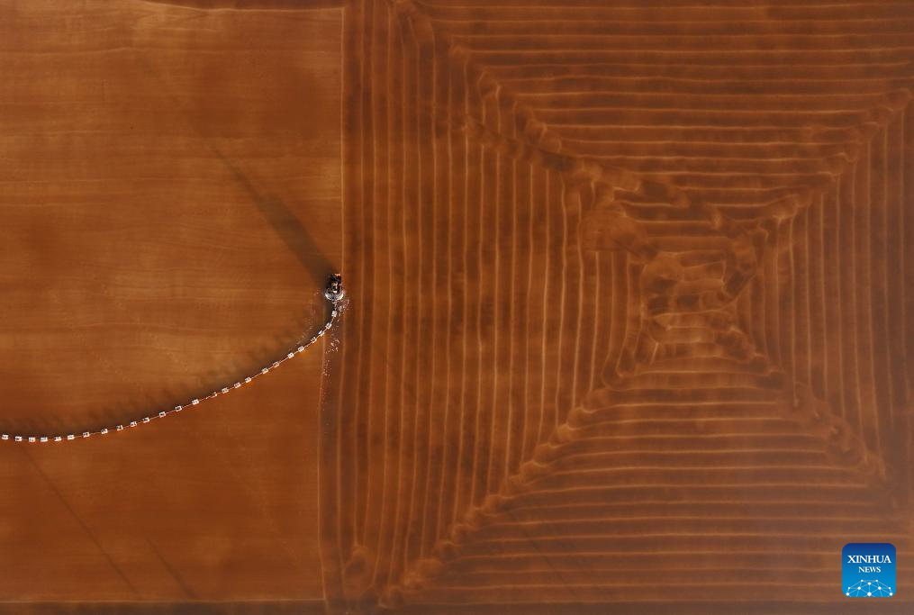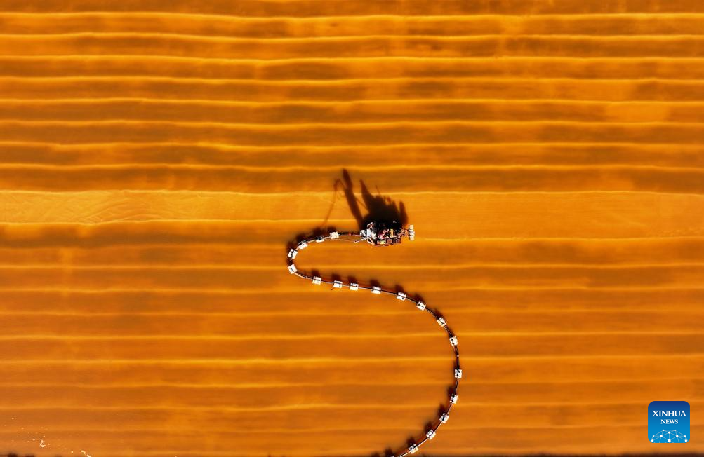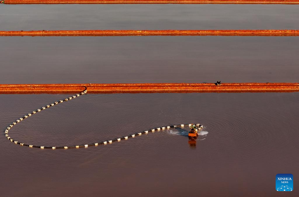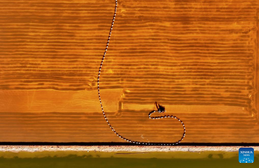 SHIJIAZHUANG, 16 octubre, 2024 (Xinhua) -- Vista aérea tomada con un dron el 16 de octubre de 2024 de un trabajador operando maquinaria para cosechar sal en el campo de sal de Nanpu, en el distrito de Caofeidian de Tangshan, en la provincia de Hebei, en el norte de China. (Xinhua/Yang Shiyao)
