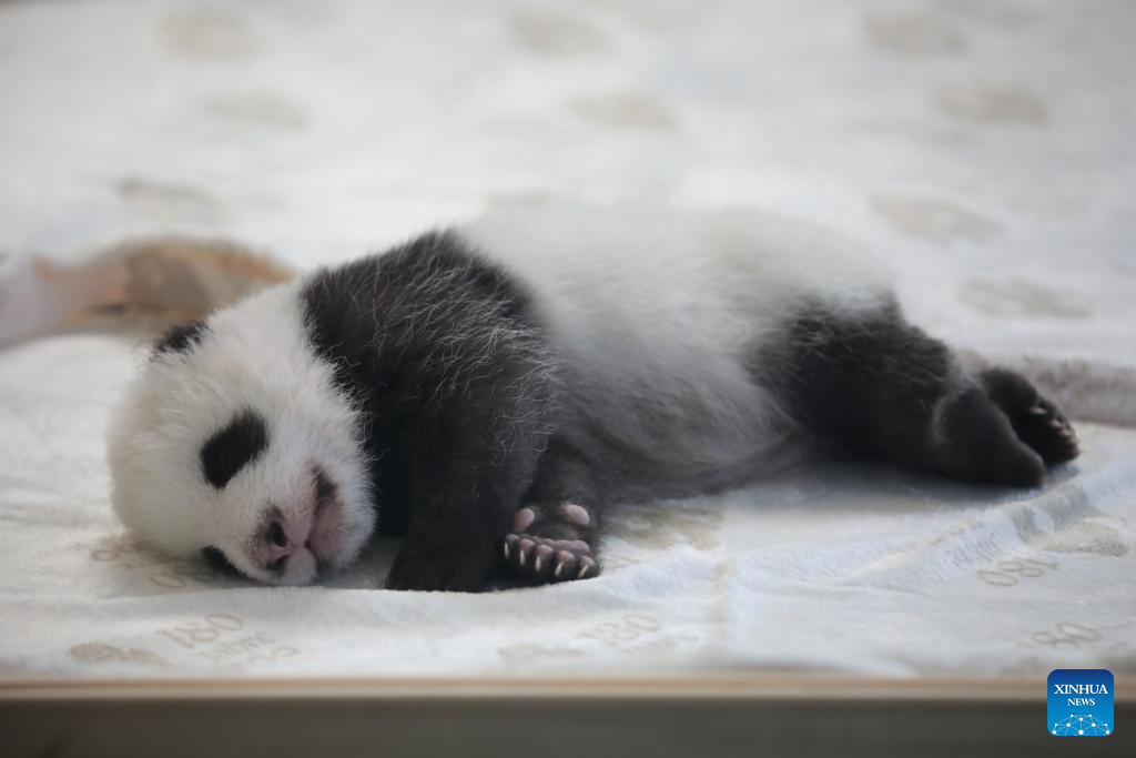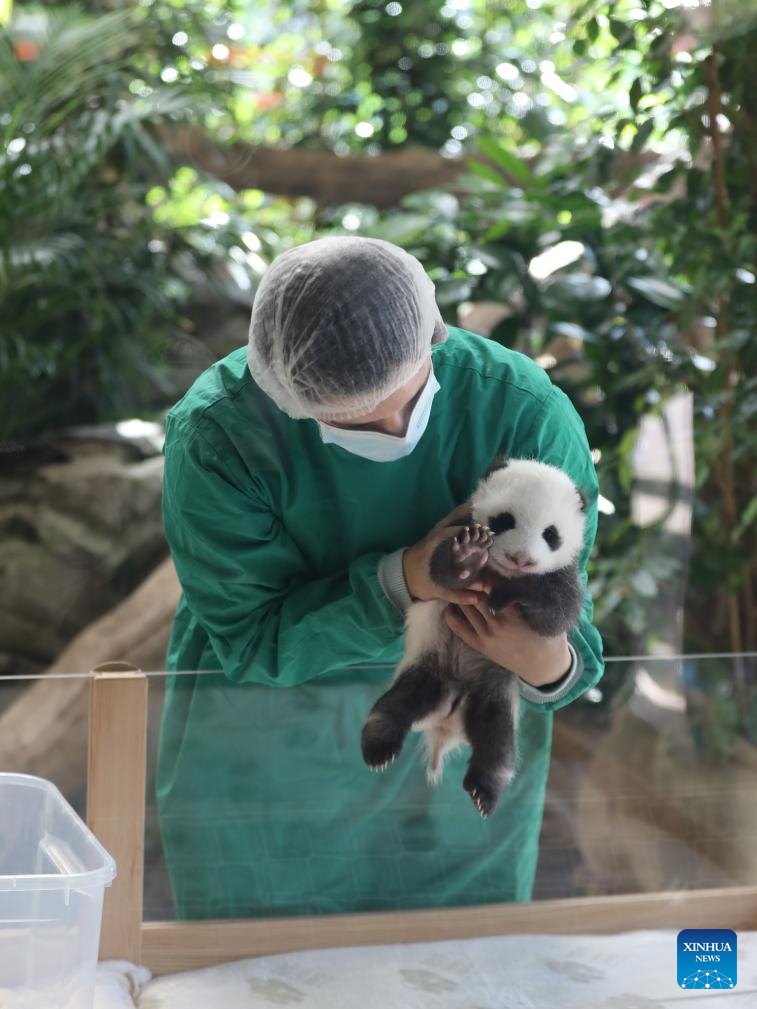 BERLIN, 16 octubre, 2024 (Xinhua) -- Imagen del 15 de octubre de 2024 de una cachorra de panda gigante vista en el Zoológico de Berlín, en Berlín, Alemania. Las nuevas residentes del Zoológico de Berlín, una pareja de pandas hermanas, nacidas a finales de agosto, hicieron su esperado debut ante la prensa el martes y darán la bienvenida al público a partir del miércoles. (Xinhua/Du Zheyu)