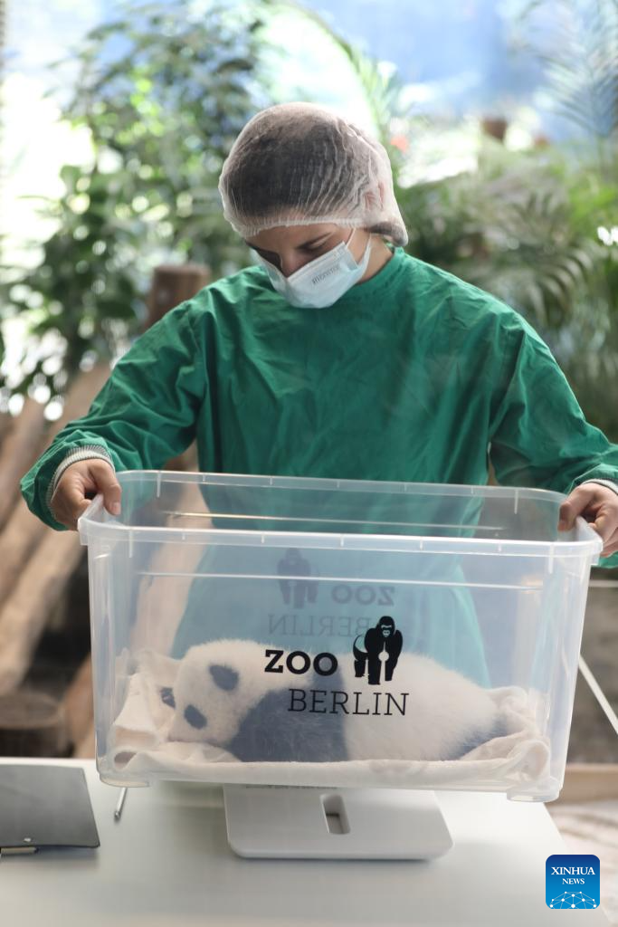 BERLIN, 16 octubre, 2024 (Xinhua) -- Imagen del 15 de octubre de 2024 de un empleado preparándose para llevar a una cachorra de panda gigante de regreso a su recinto en el Zoológico de Berlín, en Berlín, Alemania. Las nuevas residentes del Zoológico de Berlín, una pareja de pandas hermanas, nacidas a finales de agosto, hicieron su esperado debut ante la prensa el martes y darán la bienvenida al público a partir del miércoles. (Xinhua/Du Zheyu)