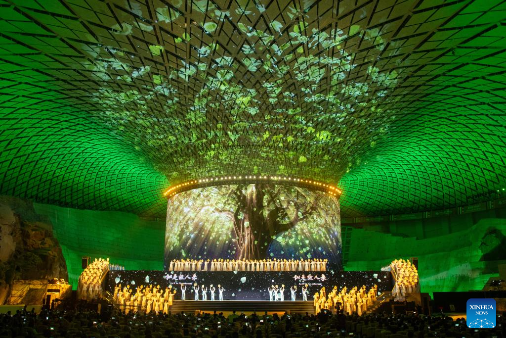 NINGBO, 16 octubre, 2024 (Xinhua) -- Imagen del 15 de octubre de 2024 de la ceremonia de inauguración del sexto Foro Budista Mundial llevada a cabo en Ningbo, en la provincia de Zhejiang, en el este de China. El foro comenzó aquí el martes y alrededor de 800 representantes, expertos y académicos de la comunidad budista de 72 países y regiones asistieron al foro. (Xinhua/Jiang Han)